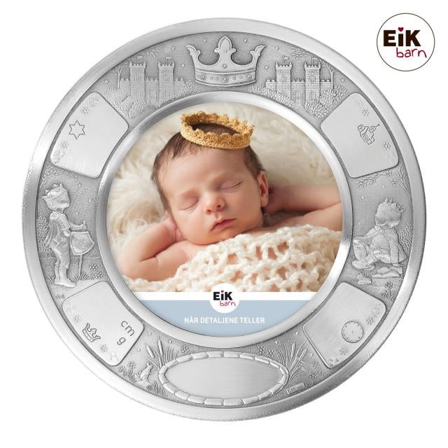 Kaunis lapsen ensikehys. Pyöressä kehyksessä on kohokuviointi jossa on kuvattu pienen Prinssin seikkailuja.