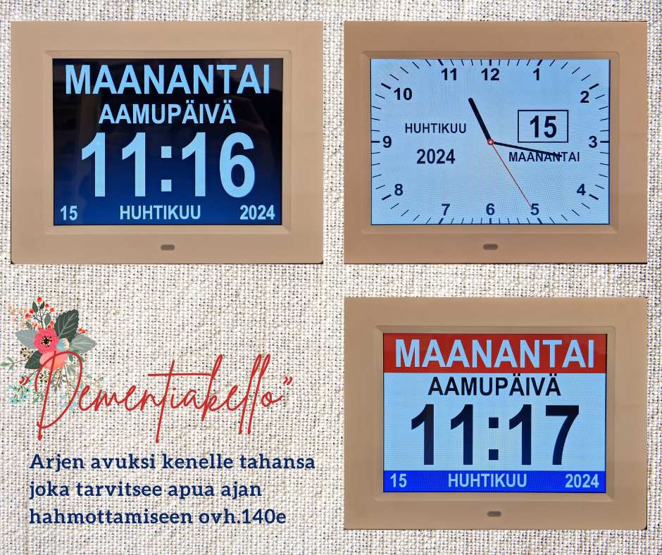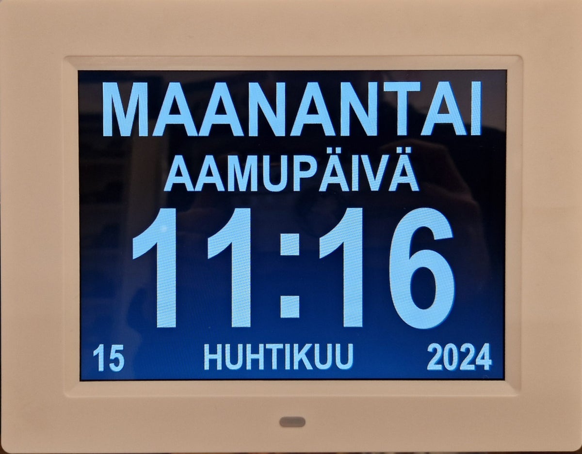 Dementiakello arjen avuksi muistisairaalle tai ihan kenelle tahansa. Selkeä näyttö, suomenkielinen valikko ja ohje.