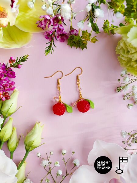 Materiaalit: Polymeerimassaa, helmet lasia. Koukku allergiaystävällistä kirurginterästä (nikkelitön), muut metalliosat hopeoitua terästä (nikkelitön). Kullanvärisissä korvakoruissa koukku on kullattua kirurginterästä (nikkelitön), muut metalliosat kullanväristä terästä (nikkelitön).