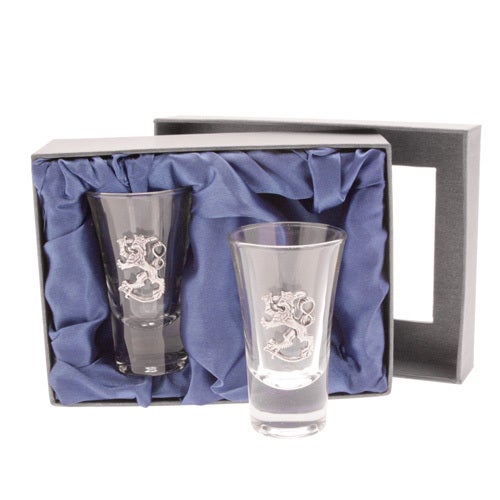 Snapsipikaripari Suomileijona tinalaatalla. Snapsilasit toimitetaanlahjalaatikossa.